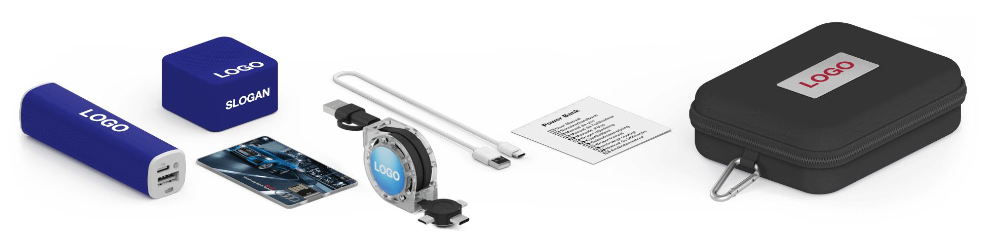 Combine 4 products in a handy Travel Merch Pack: Wafer USB Card, Core Power Bank, Motion USB Cable, Ray Bluetooth® Speaker. These carefully curated products can be branded with your logo, website address, slogan and more. The top of the Gift Case can also be Laser Engraved or Screen Printed in up to 4 colors. Any product color combinations are allowed.